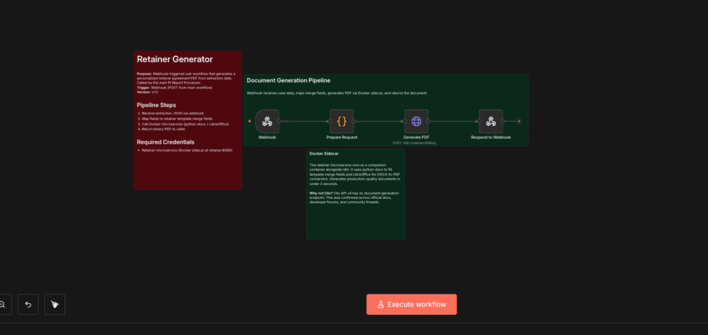 So we built our own. A dedicated Docker container running Python and LibreOffice generates retainer agreements from a Word template with conditional logic. When injuries are reported, the document includes injury-specific legal language. When the injury count is zero, different language appears. This is not a static template with blanks filled in — it is context-aware document generation. Generation time: under 2 seconds.