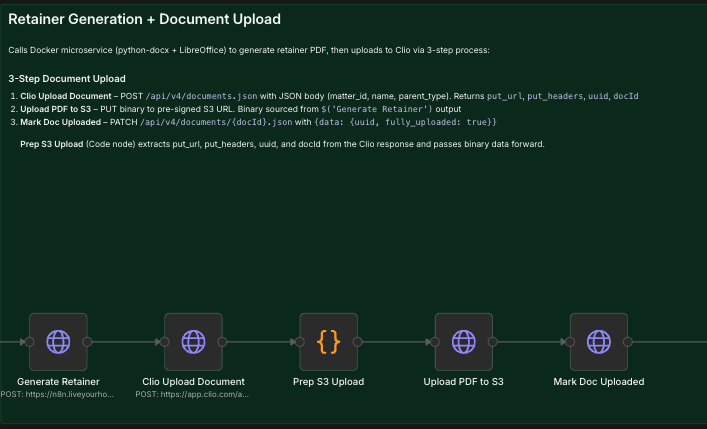 The single hardest integration in the entire pipeline was getting the generated retainer into Clio. The V4 API documentation describes creating a document record. What it does not clearly document is that upload is a three-step process: